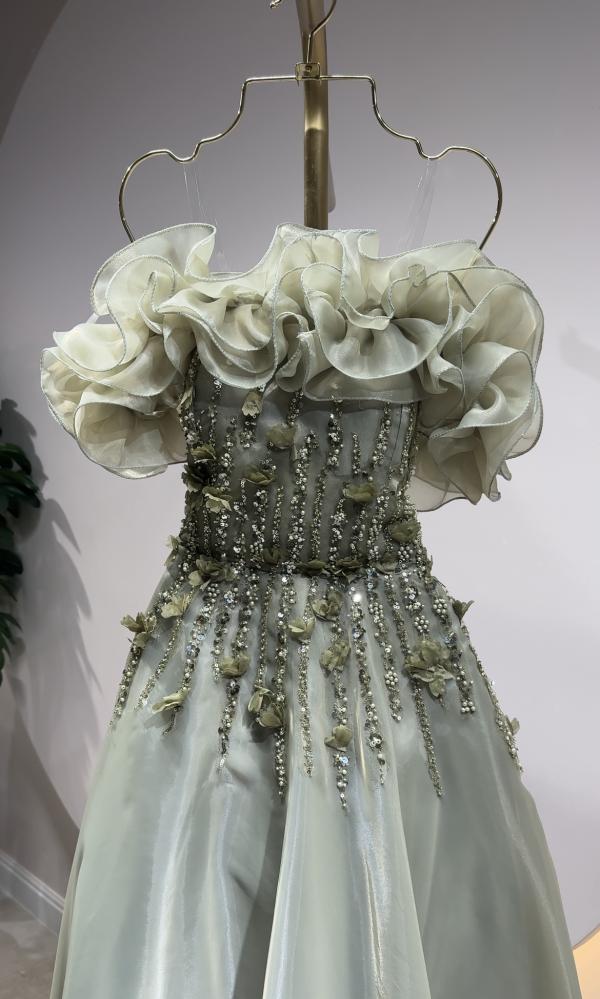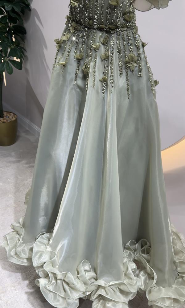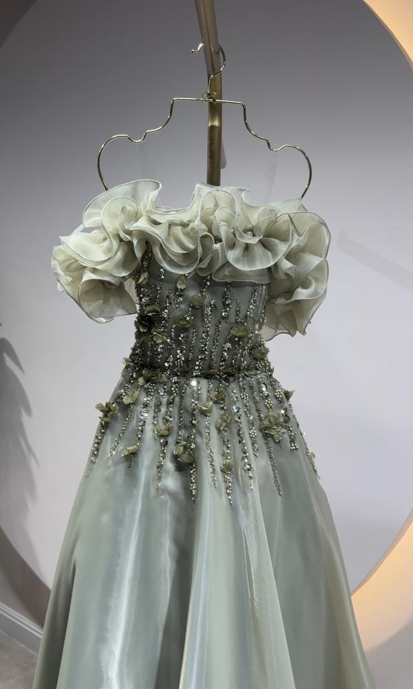 يجمع بين الأورغنزا الشفافة الفاخرة والتفته الحريري الناعم ، بتفاصيل يدوية تضيف لمسة ملكية