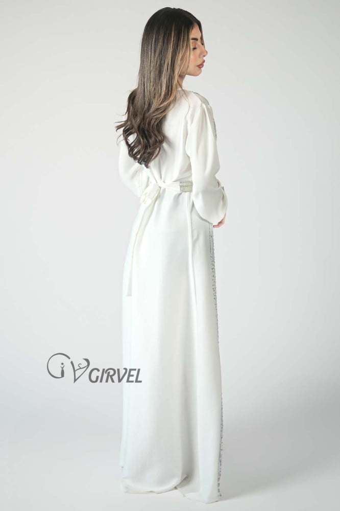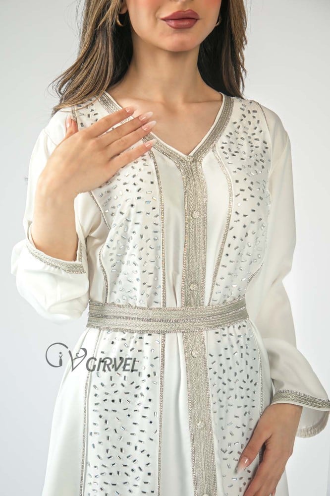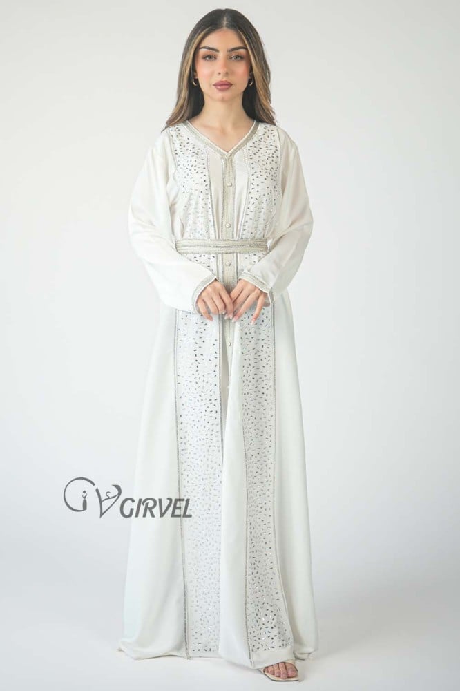 جلابية حرير مزينة بقطع كريستال وبتطريز من الامام بياقة v وباكمام طويلة مزينة بتطريز وكريستال من الاطراف بحزام خارجي مزين بكريستال وتطريز
