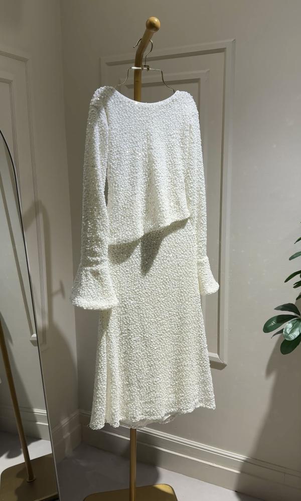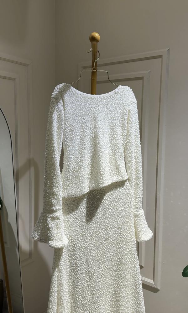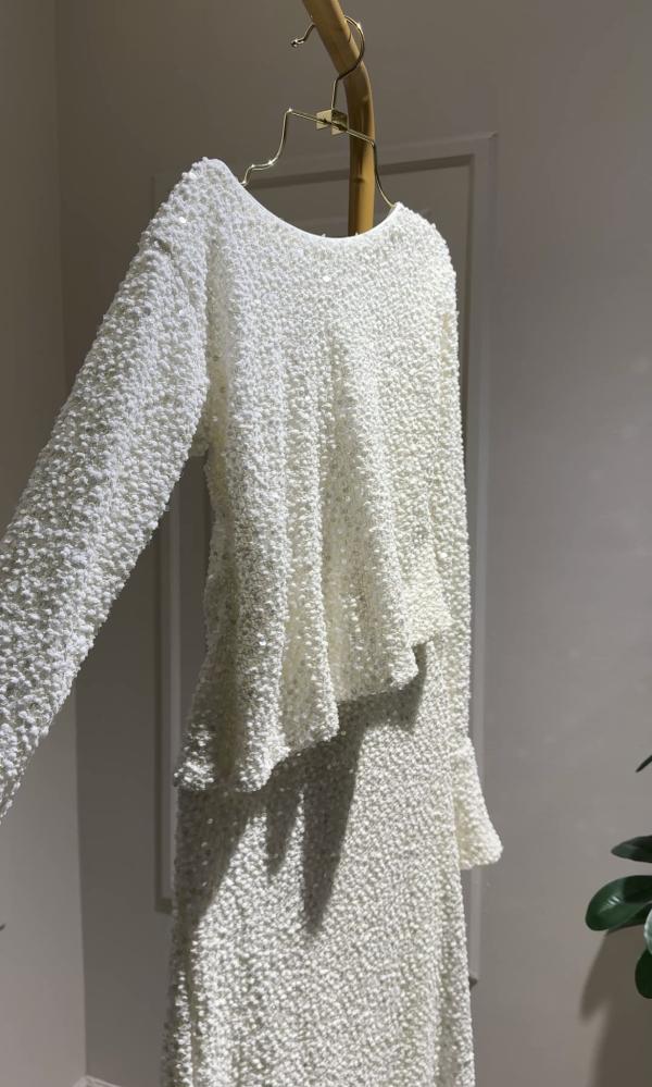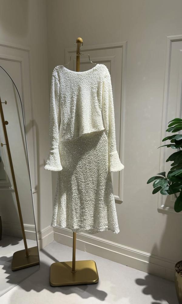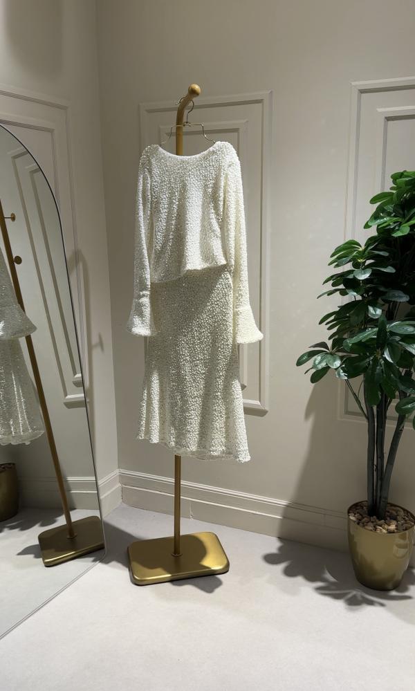تميزي بإطلالة أنيقة بطقم مكوّن من قطعتين تنورة وبلوزة باللون اللؤلؤي, تصميم أنيق ومناسب للحفلات والسهرات والمناسبات الخاصة