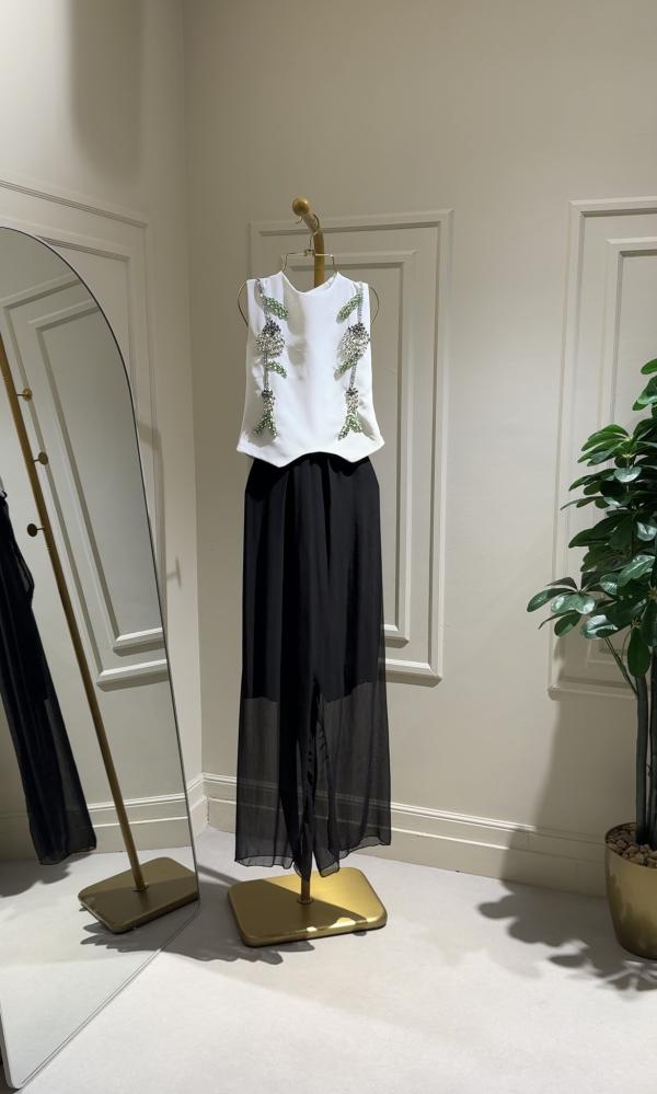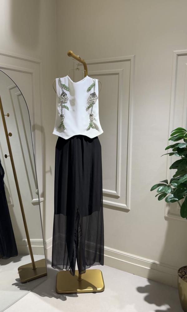 طقم بنطلون تنوره وبلوزه مزين بكريستالات فضية و أخضر