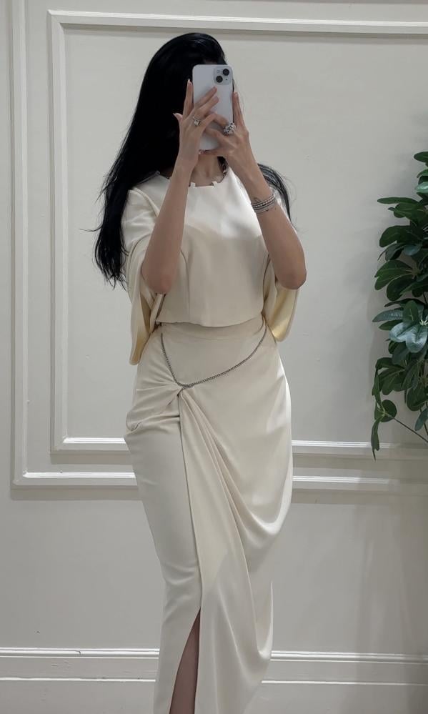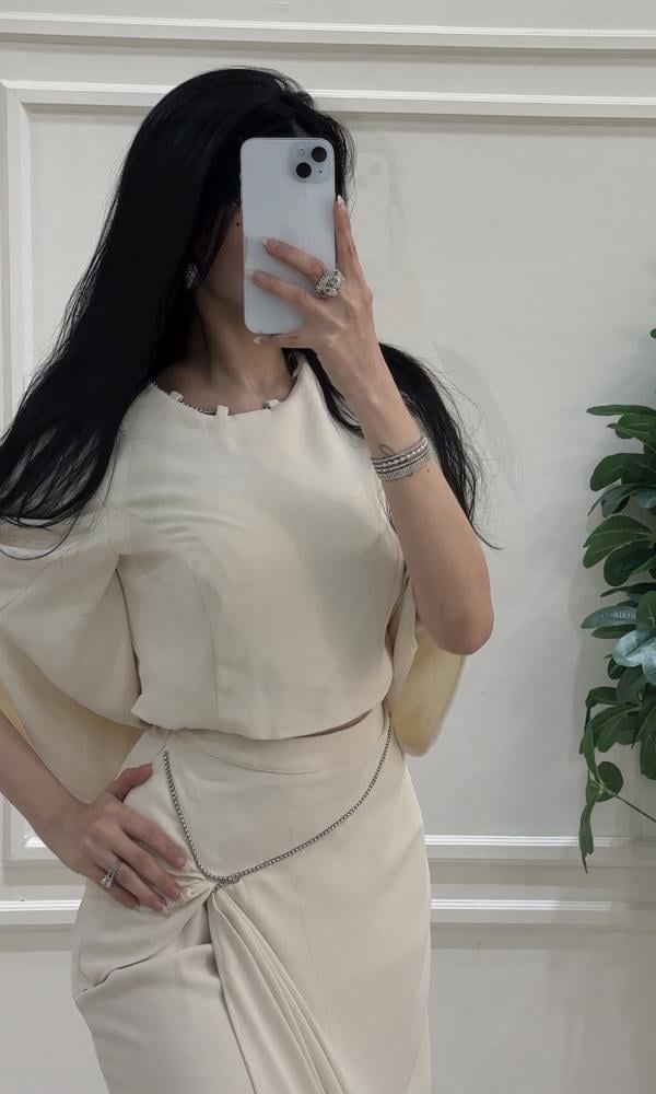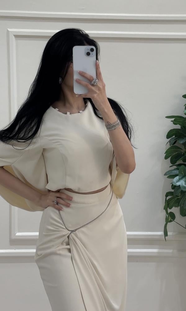 طقم من قطعتين تنورة وبلوزة كريب بفتحة بيج من الخصر