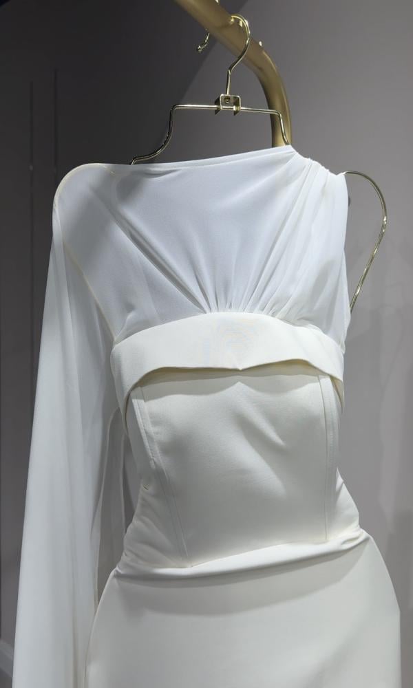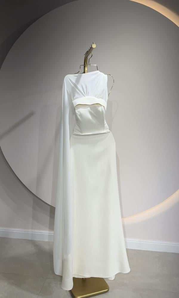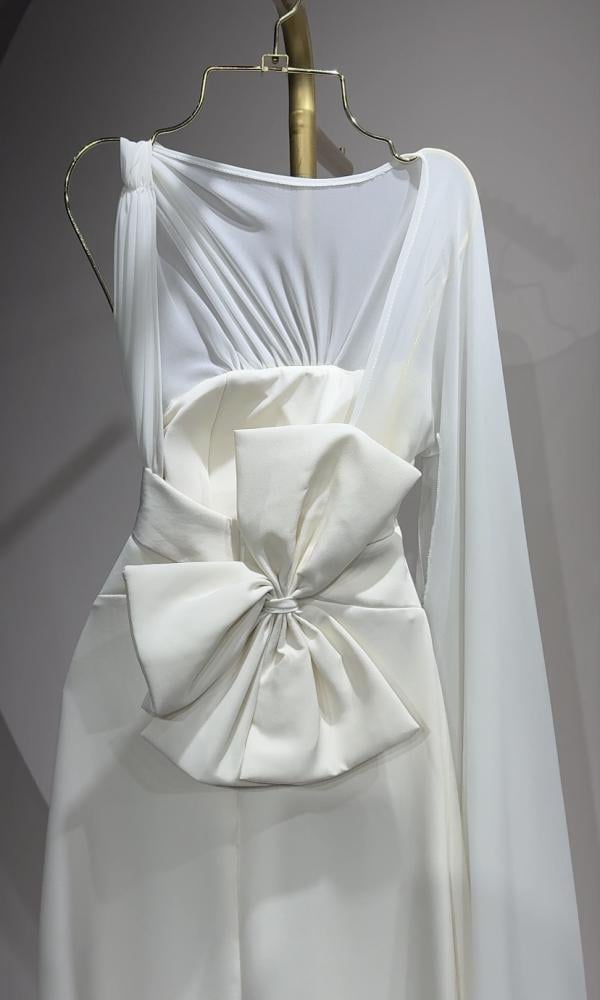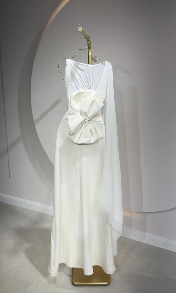 فستان ابيض ناعم بكم واحد طويل بتصميم فيونكة من الخلف