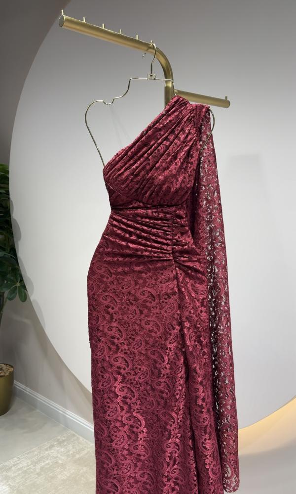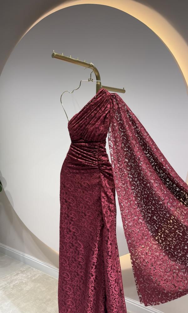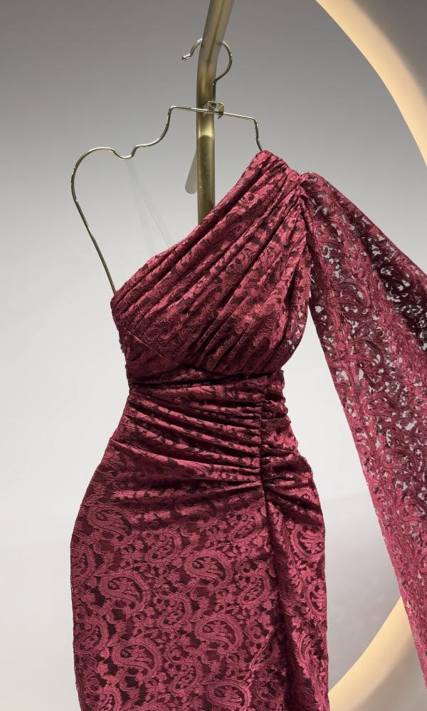 فستان احمر دانتيل بكم طويل