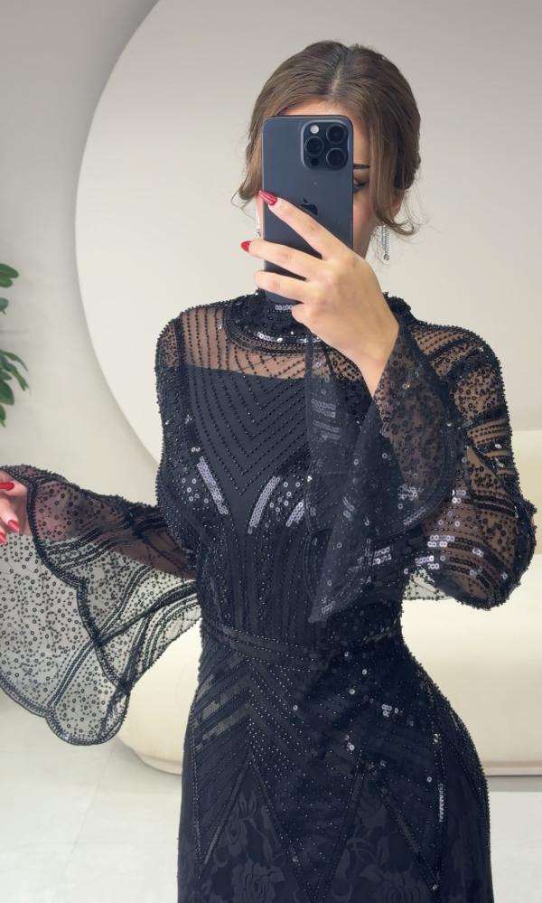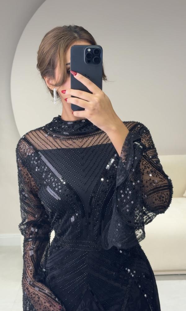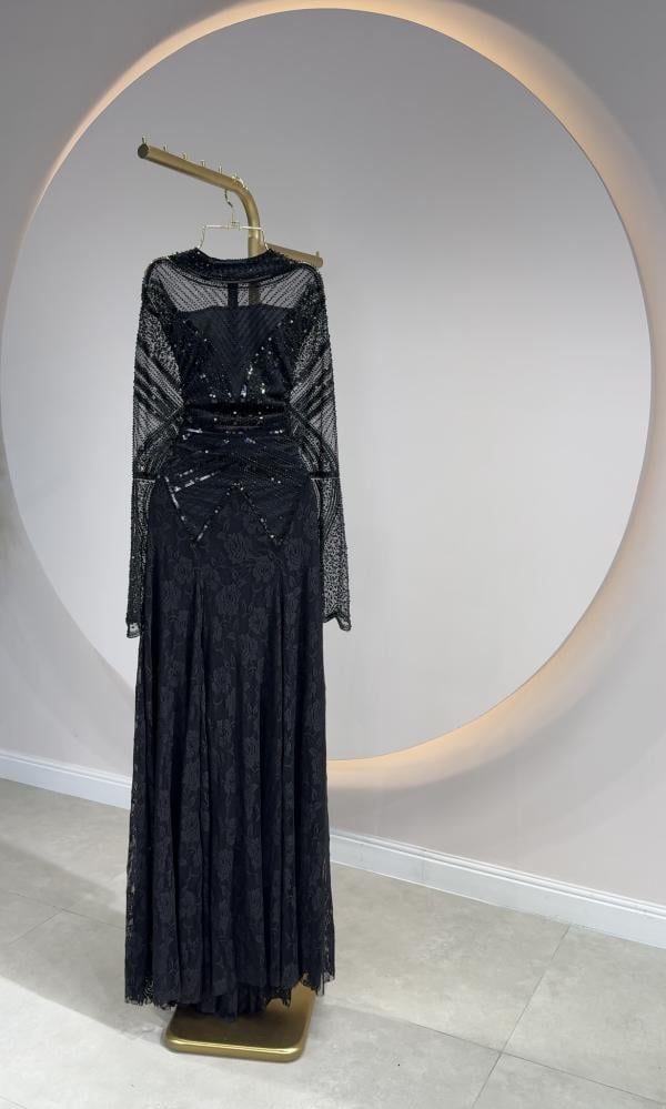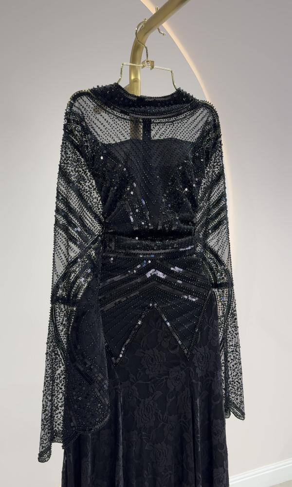 الخامات: قماش دانتيل مزين بتطريز ترتر مع بطانة باردة.