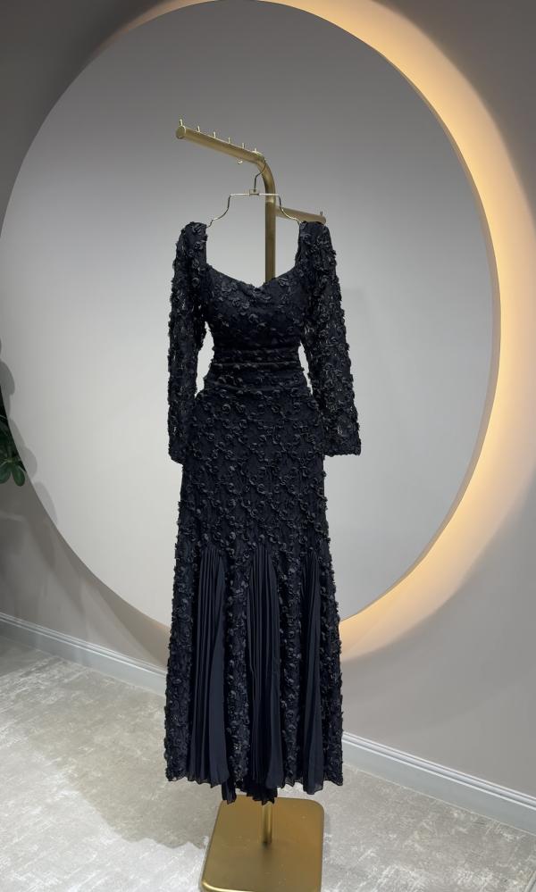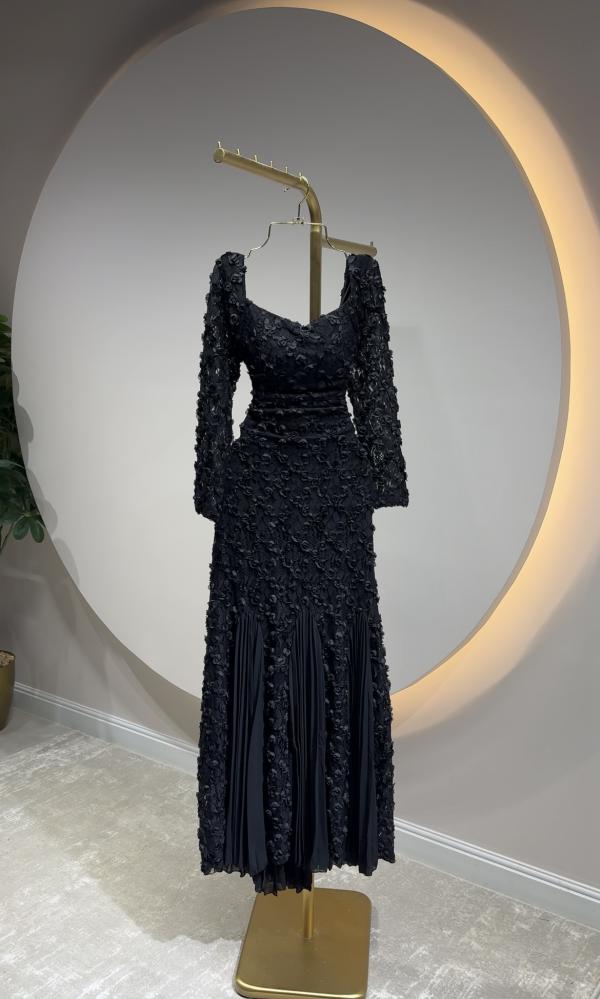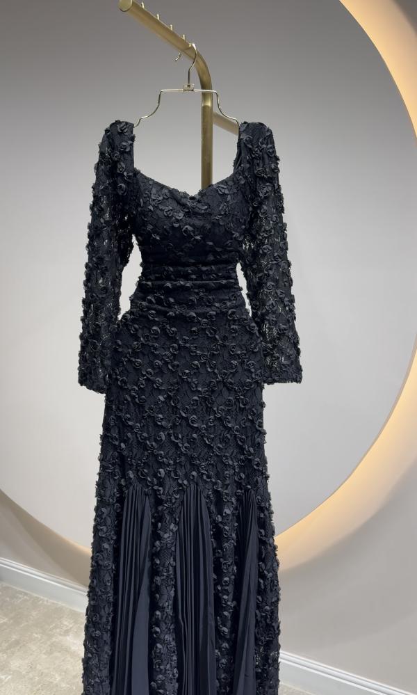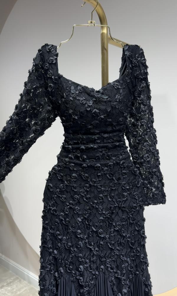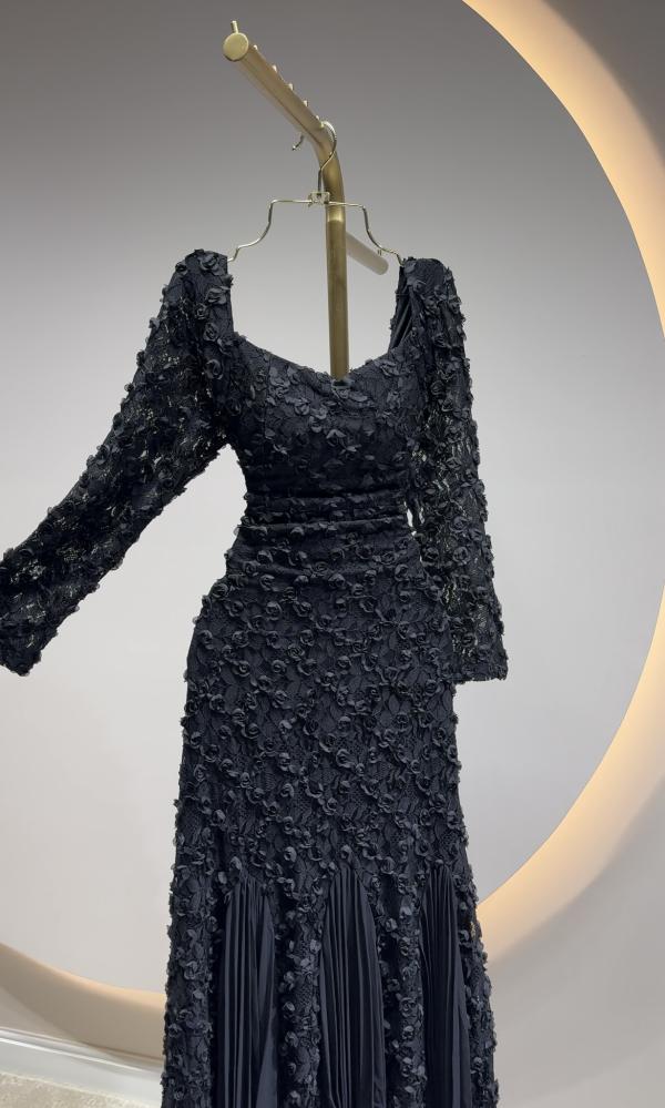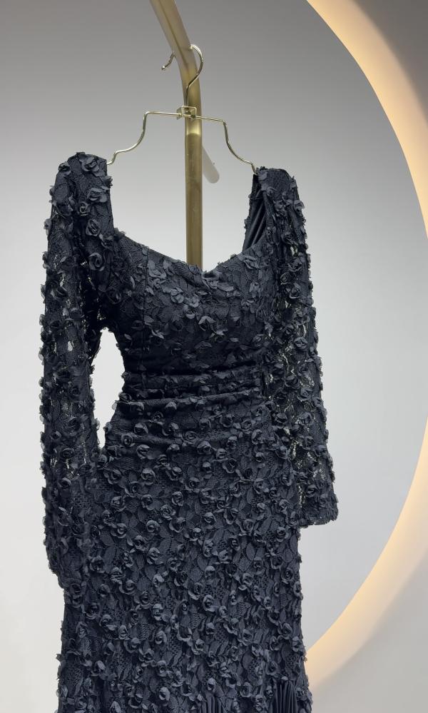 متوفر باللون الأسود الداكن الذي يجمع بين الفخامة والجاذبية، ويجعل الفستان خيارًا مثاليًا للسهرات الراقية والمناسبات الخاصة.