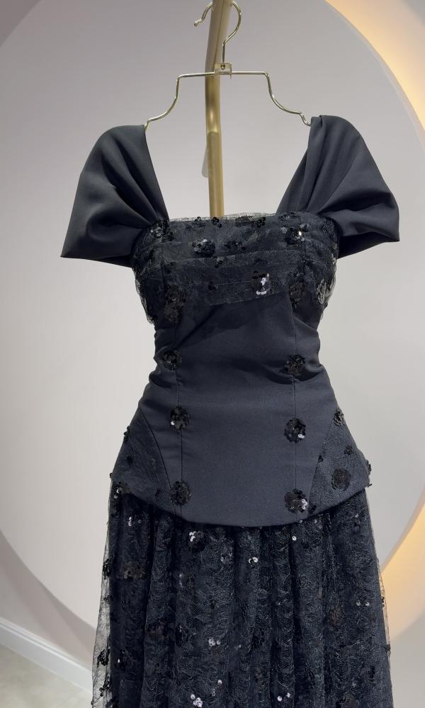 تميّزي بإطلالة راقية بفستان أسود فاخر مصمم بكورسيه ليبرز القوام يمنحك شكلا أنثوي متناسق.