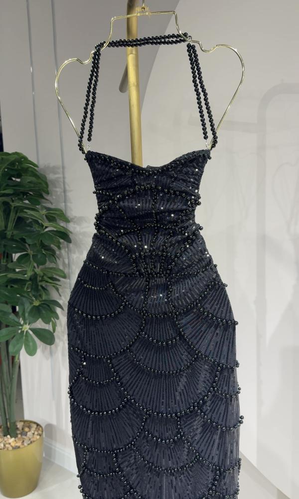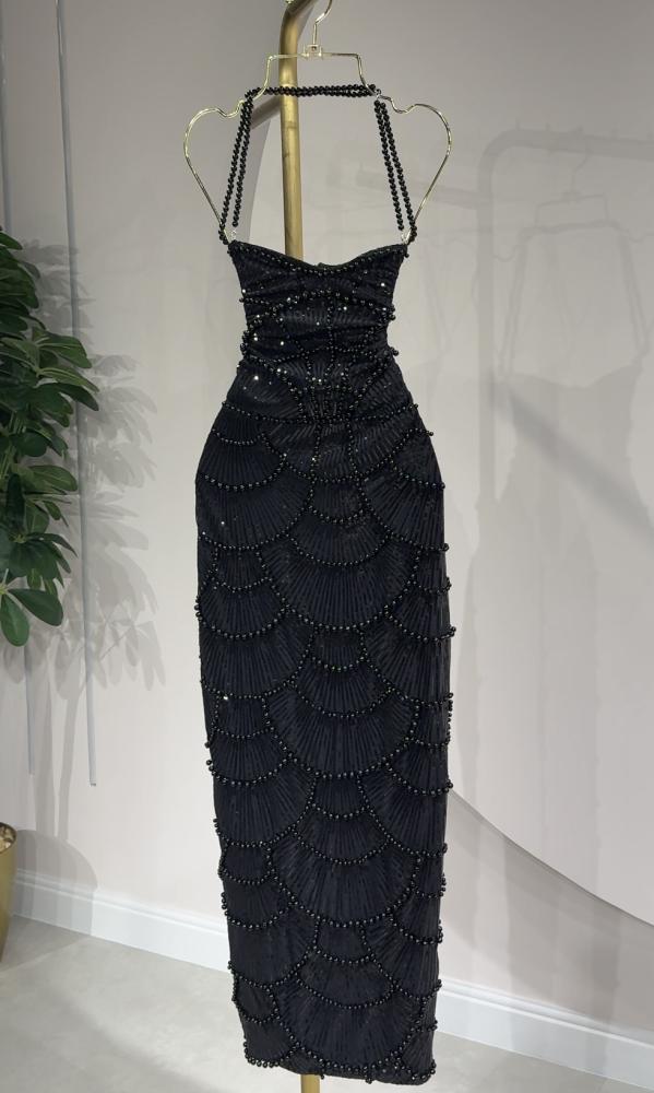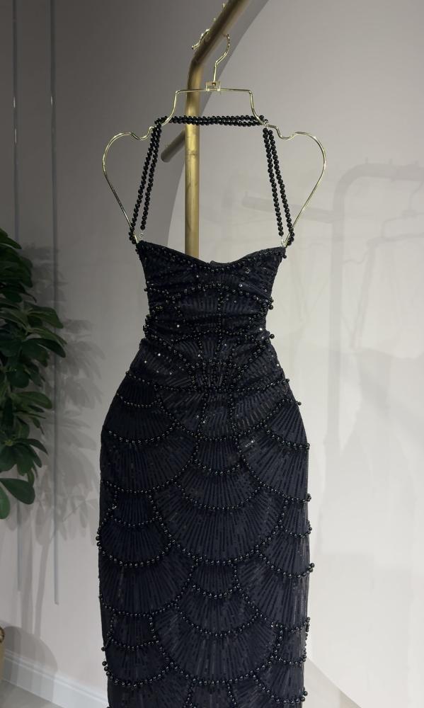 فستان اسود ميدي مزين بالخرز الكامل