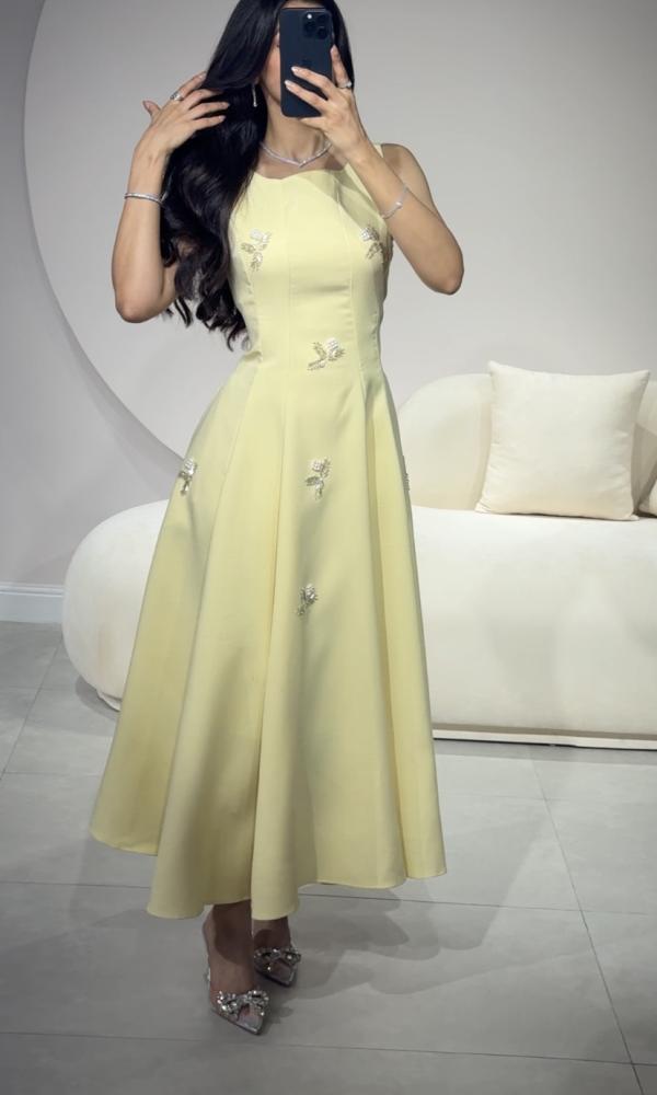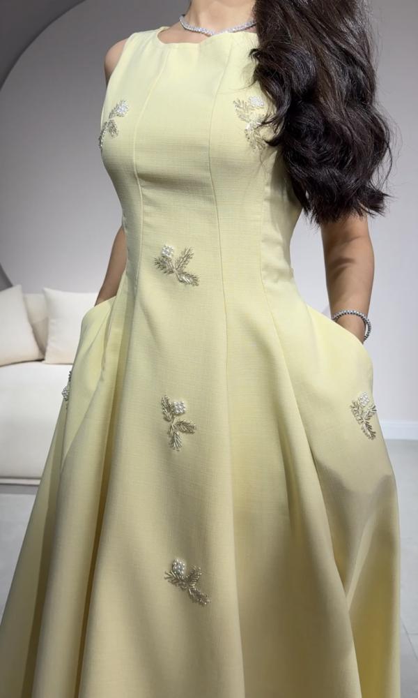 فستان اصفر فاتح ليموني بشك بسيط مع جيوب