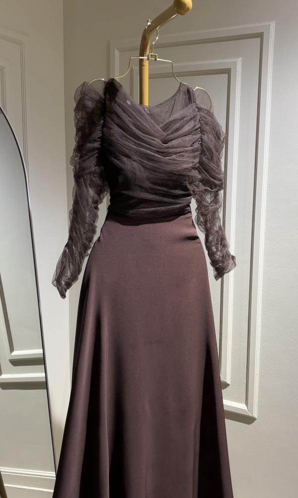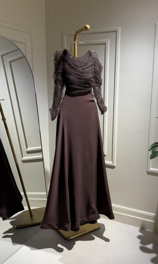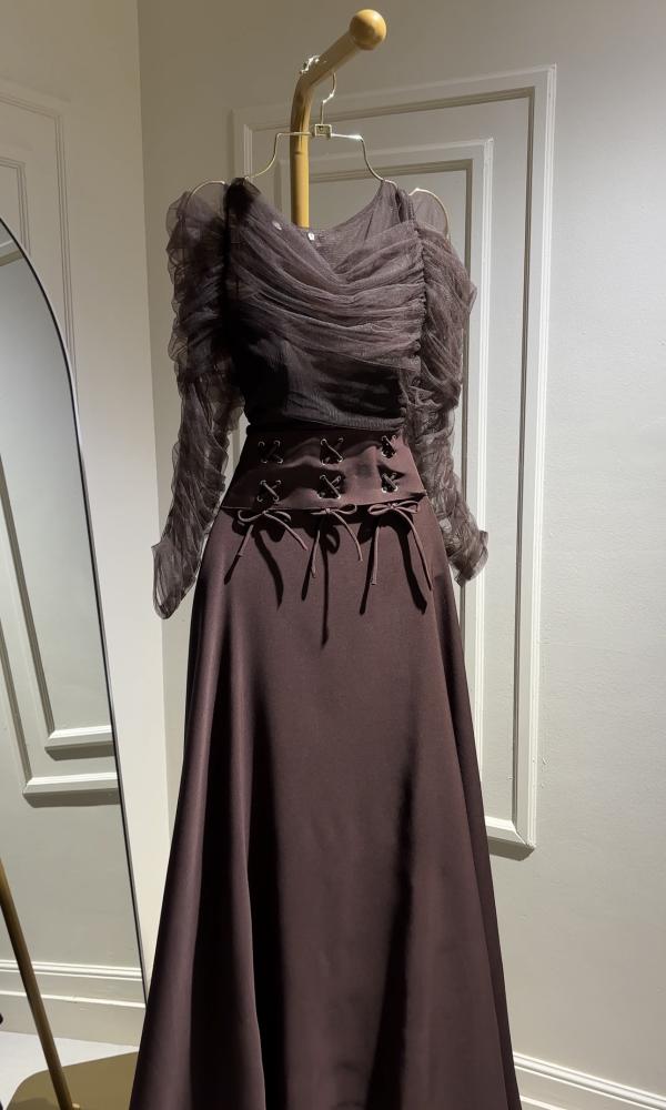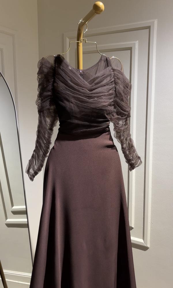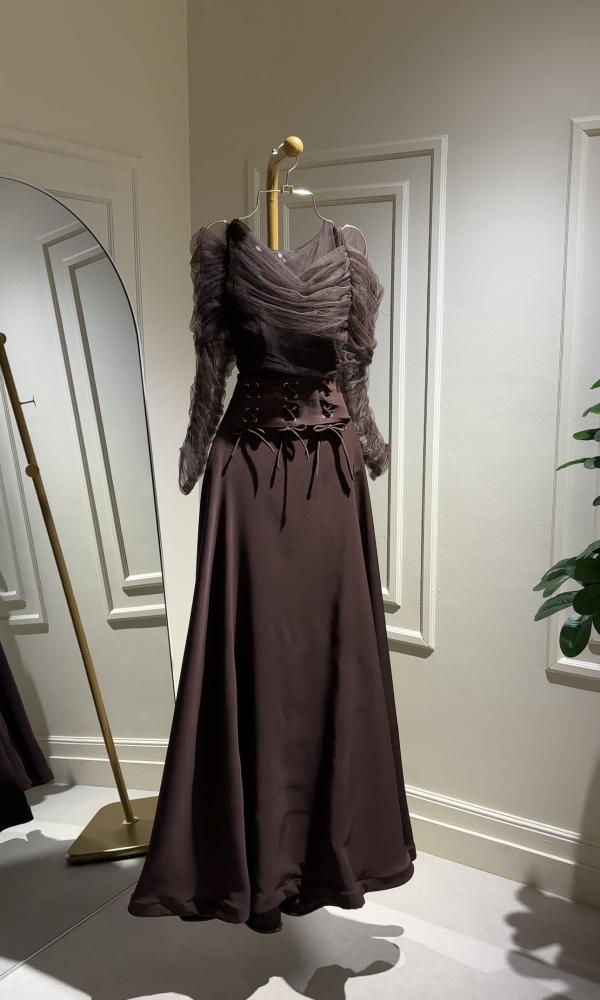 فستان بني موكا طويل بأكمام تُل وحزام كورسيه