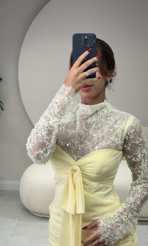• الأكمام طويلة وغير مبطنة من الدانتيل، مزينة بالترتر وتغطي الذراعين بالكامل.