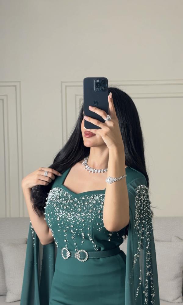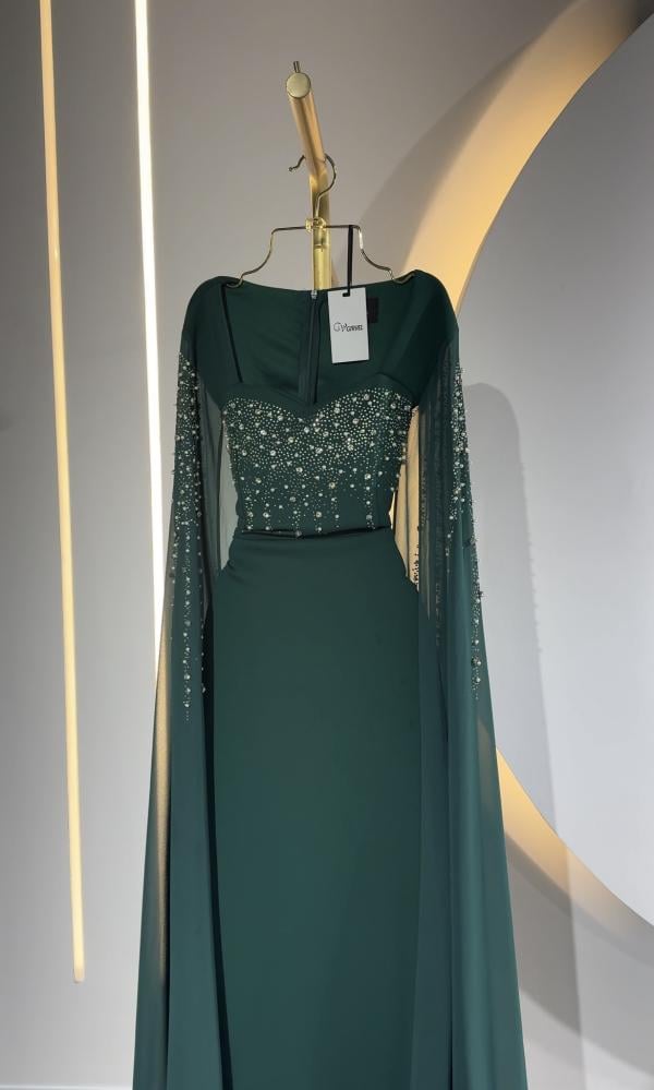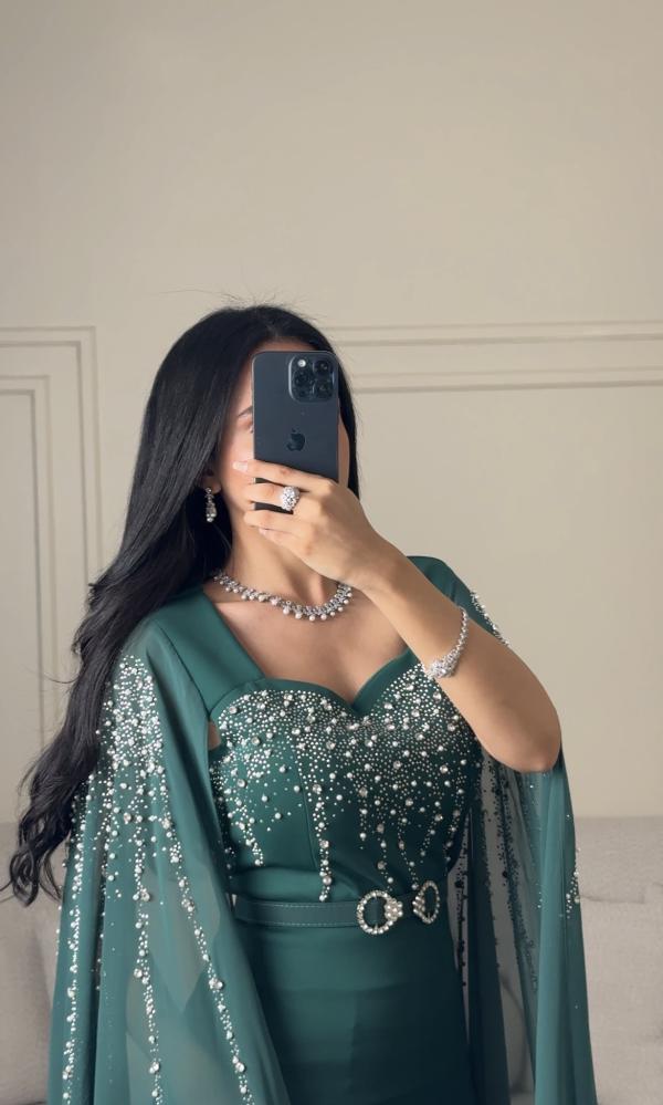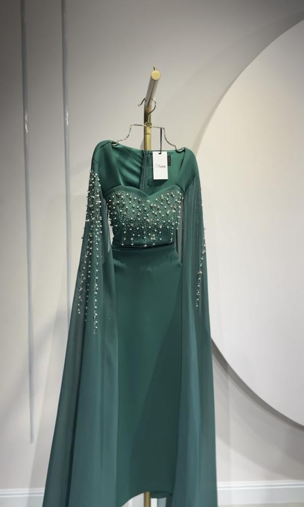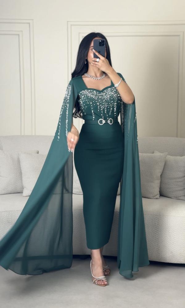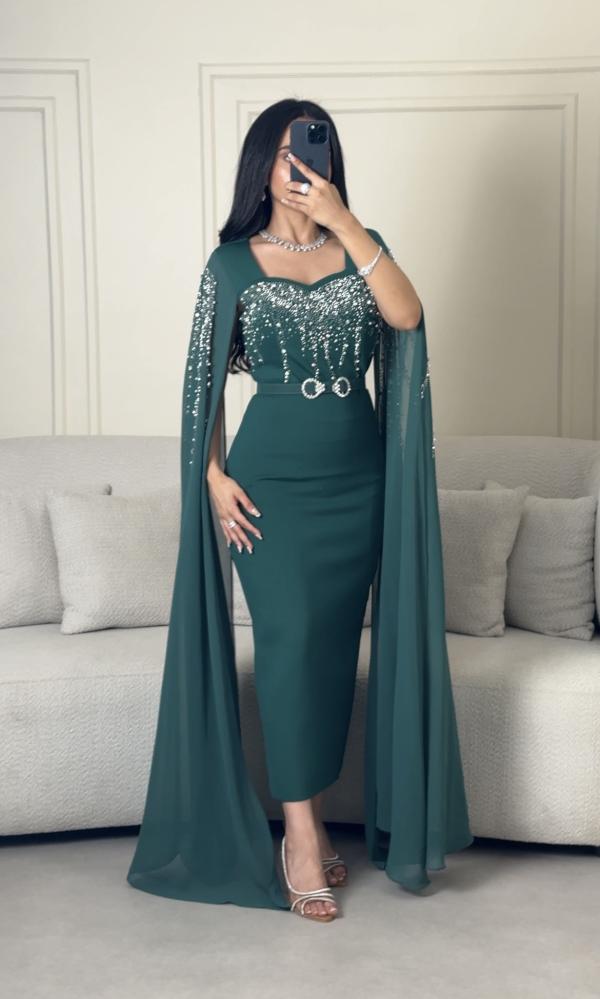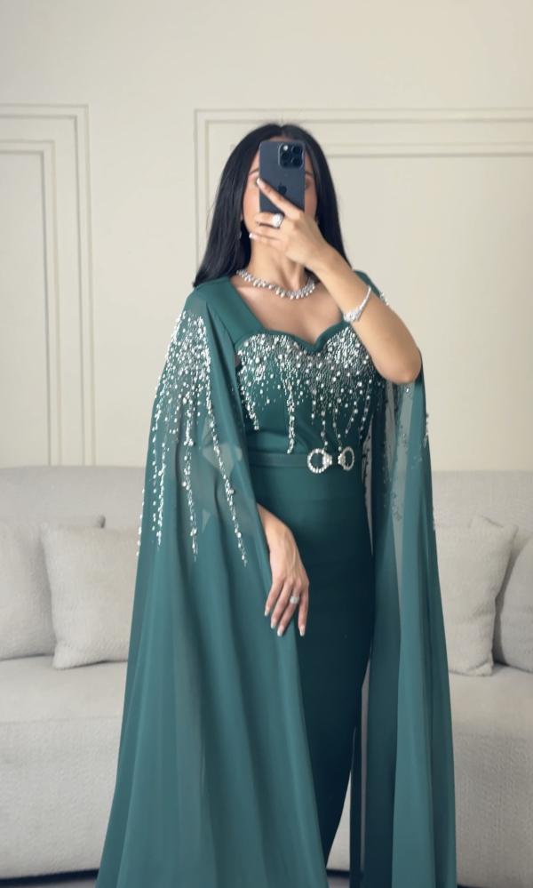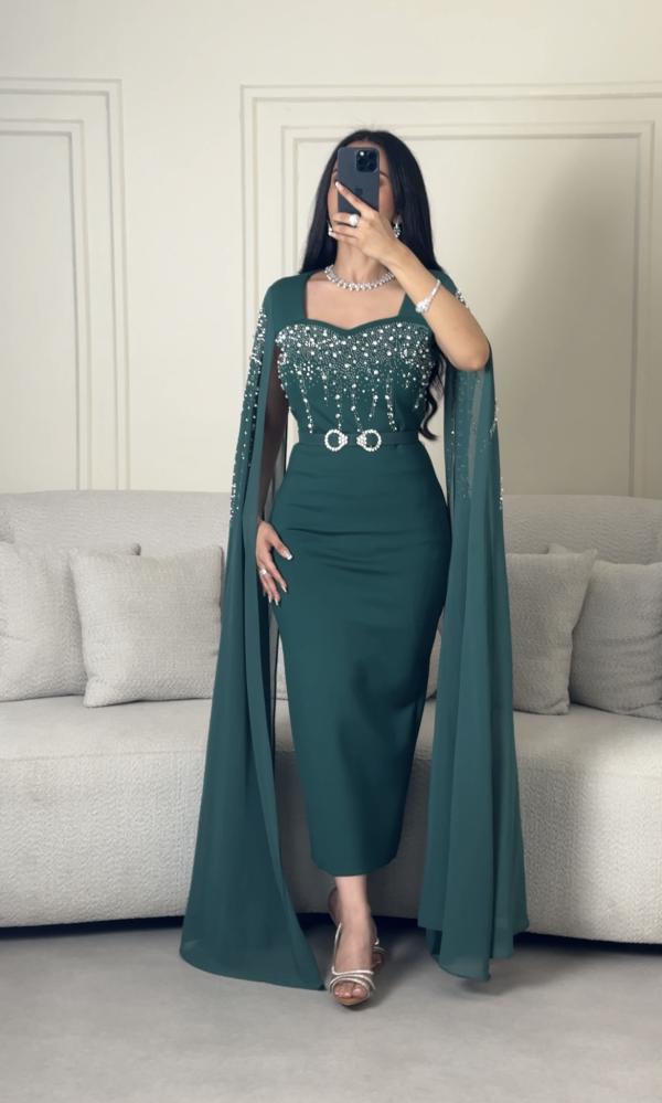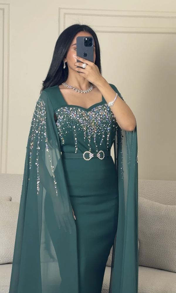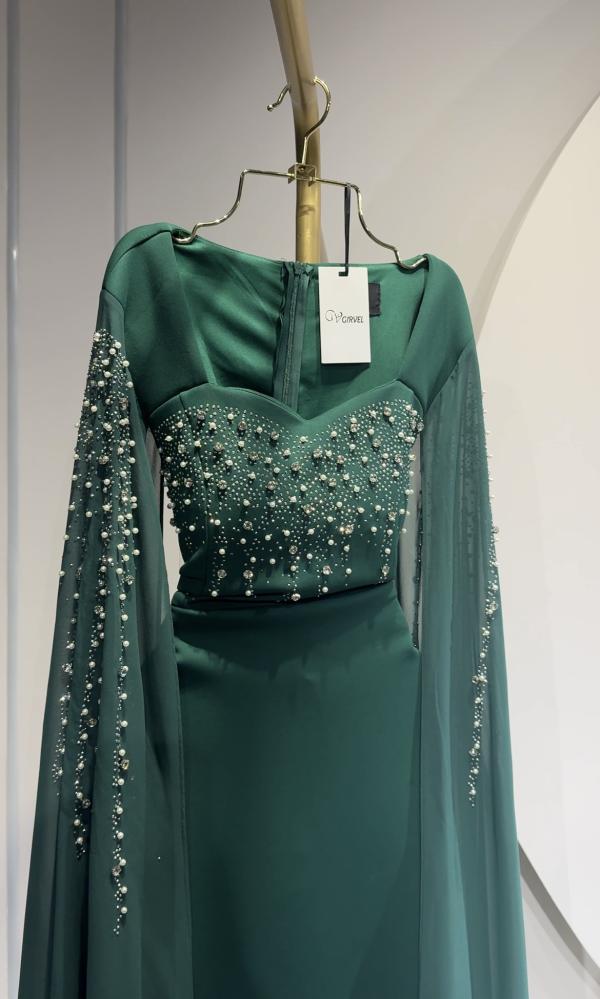 فستان سهرة طويل اخضر بأكمام طويلة