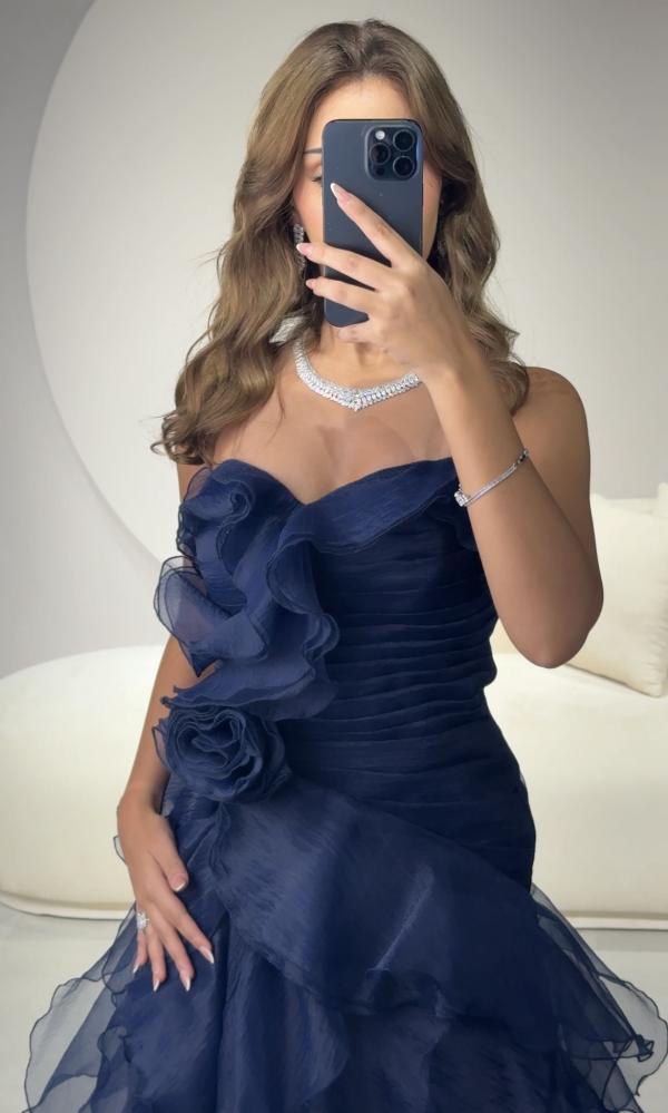 - تصميم فريد بطبقات ووردة عند الخصر من نفس القماش.