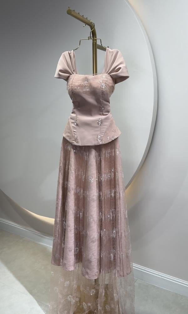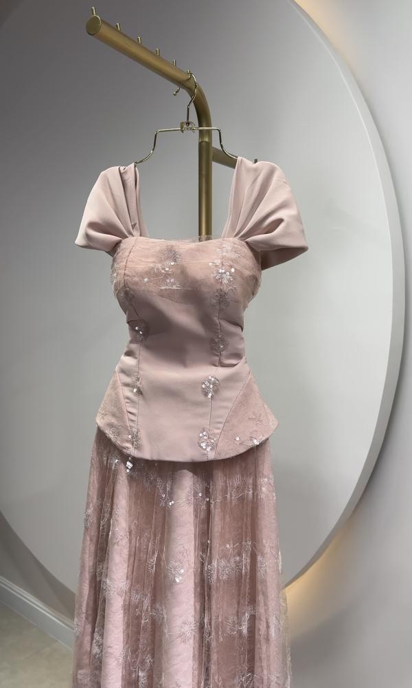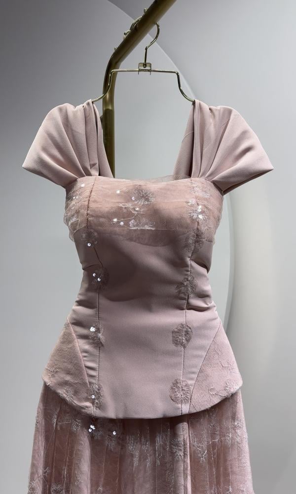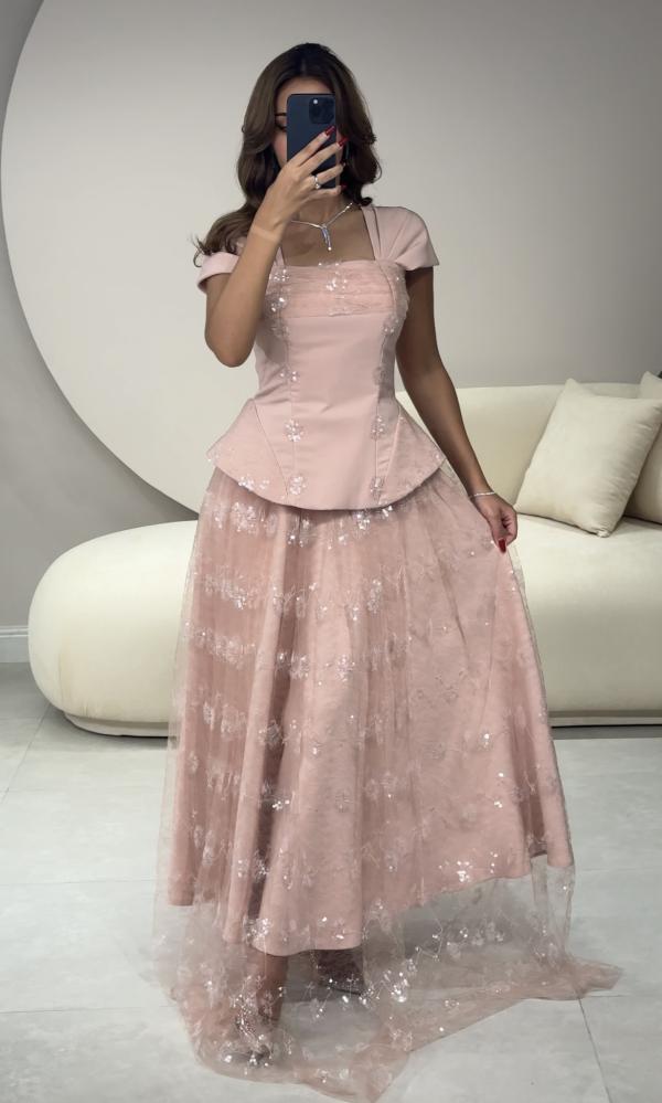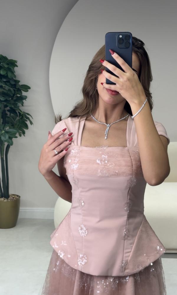 تميّزي بإطلالة راقية بفستان وردي فاخر مصمم بكورسيه ليبرز القوام يمنحك شكلا أنثوي متناسق.