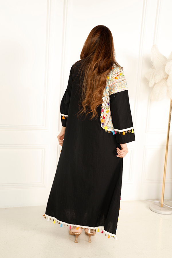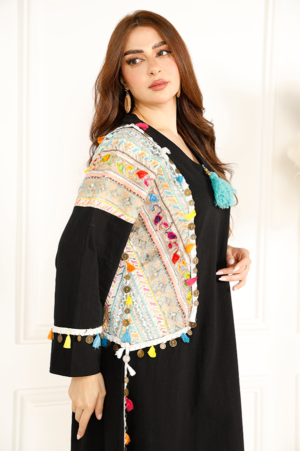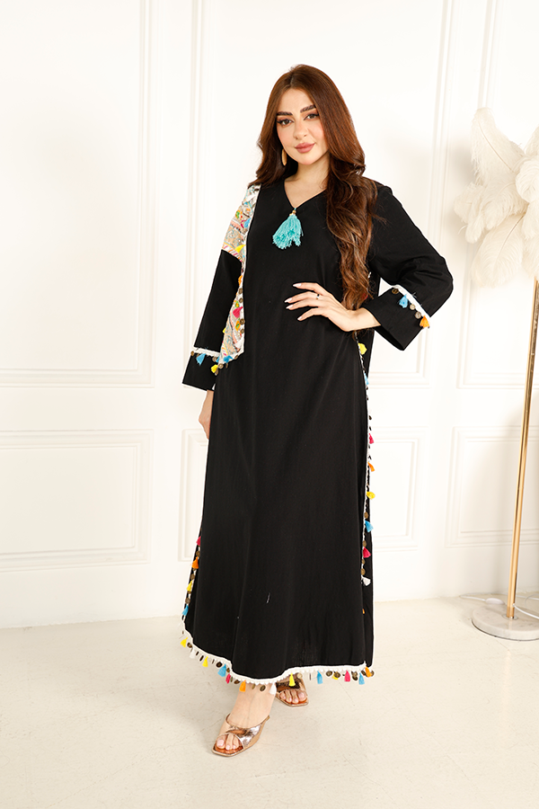 قفطان طويل بياقة V مزينة بهدب على الصدر بتطريز بنمط تراثي على الكتف باكمام طويلة مزينة بقطع هدب صغيرة ملونة على الكم والجوانب ومن الاسفل